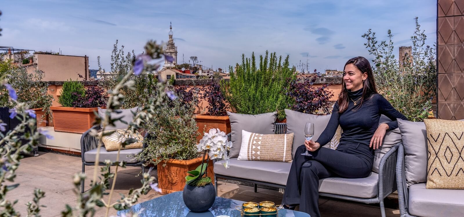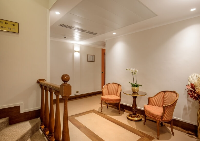 The Hotel della Torre Argentina offers its guests various common spaces, starting with an elegant Reception hall, a lounge room, a Honesty Bar and a large breakfast room, all furnished in classic Italian style. The hotel also has an enchanting rooftop on the top floor, designed to offer an exclusive place to relax and admire the suggestive view of Rome.