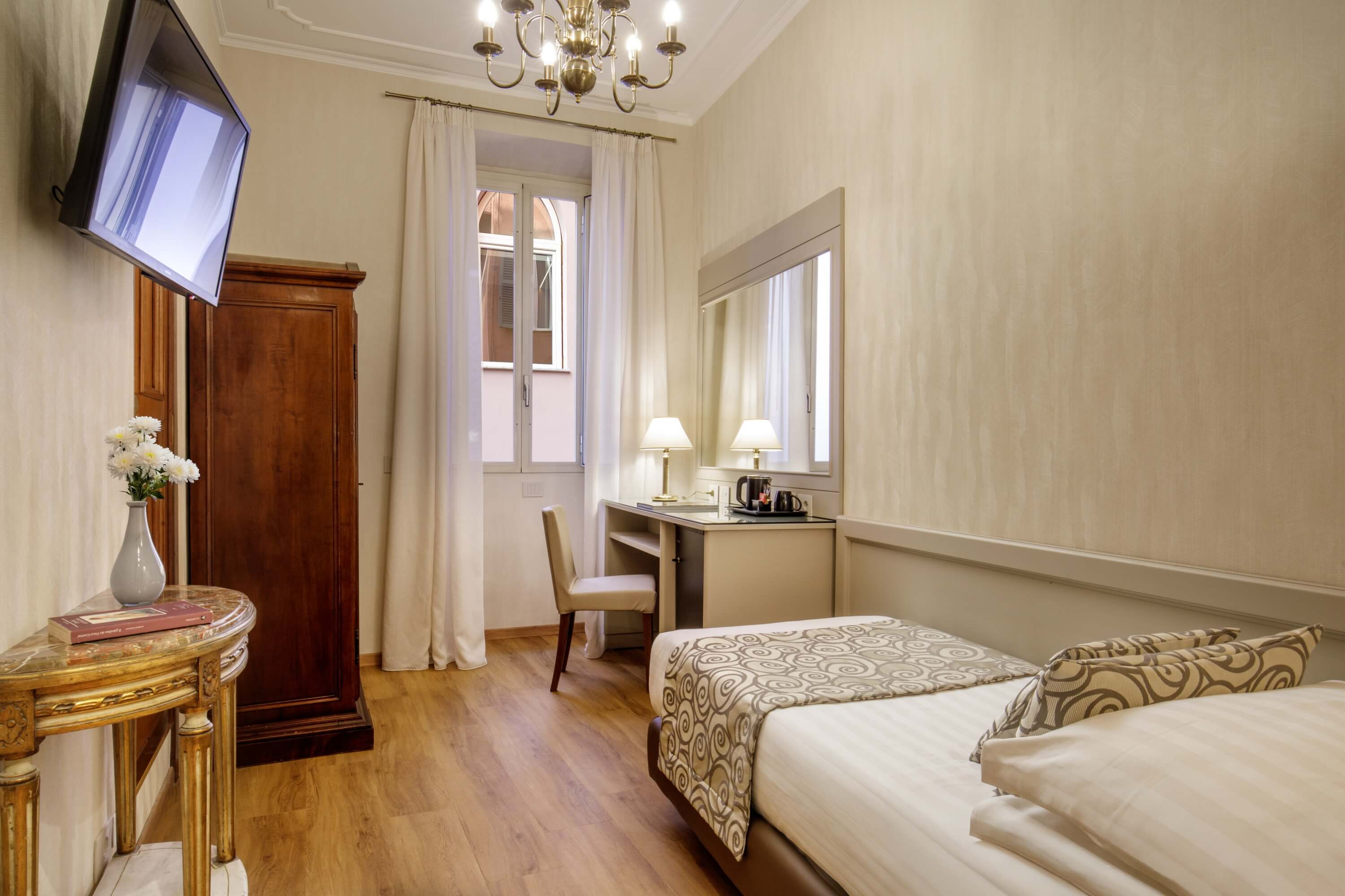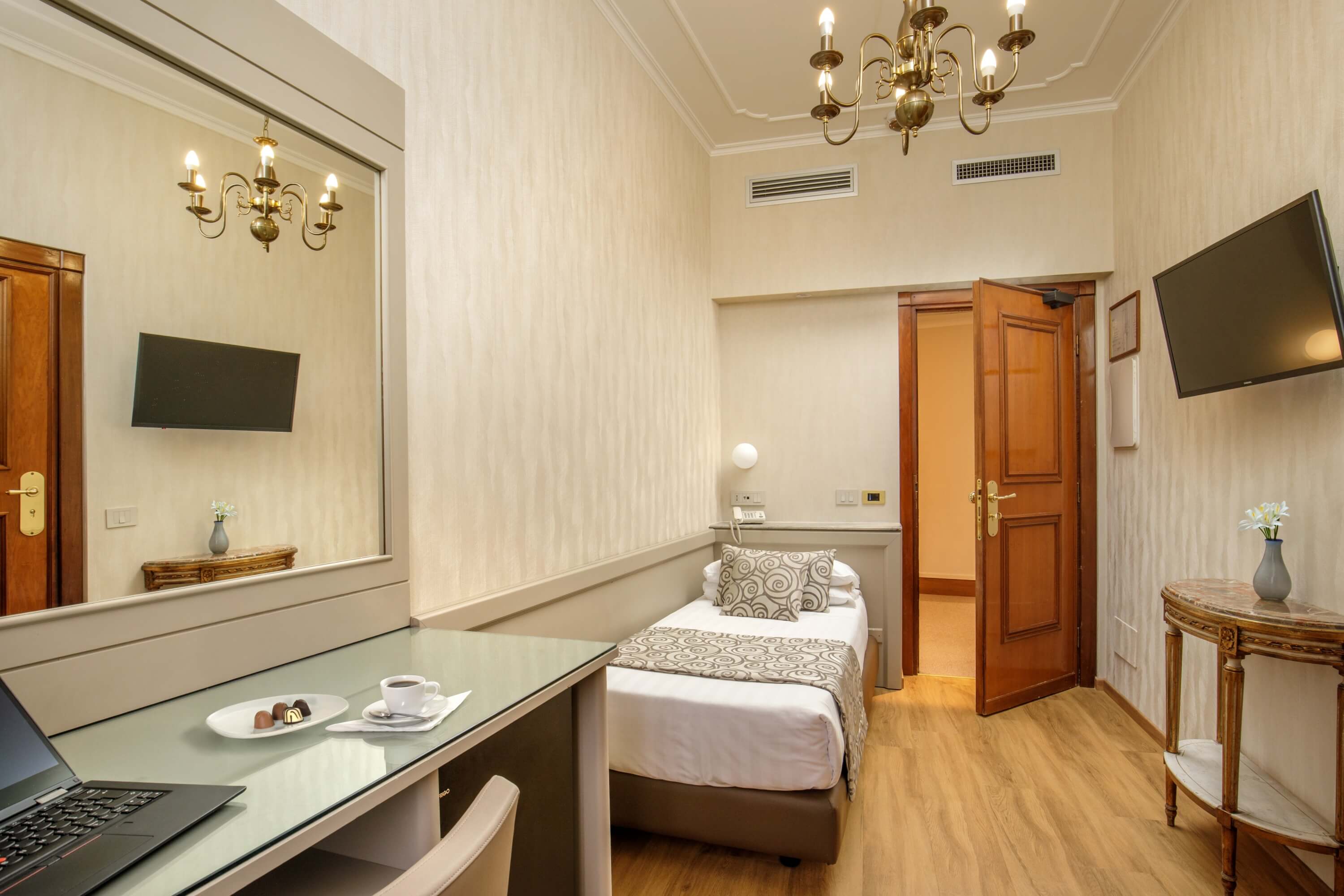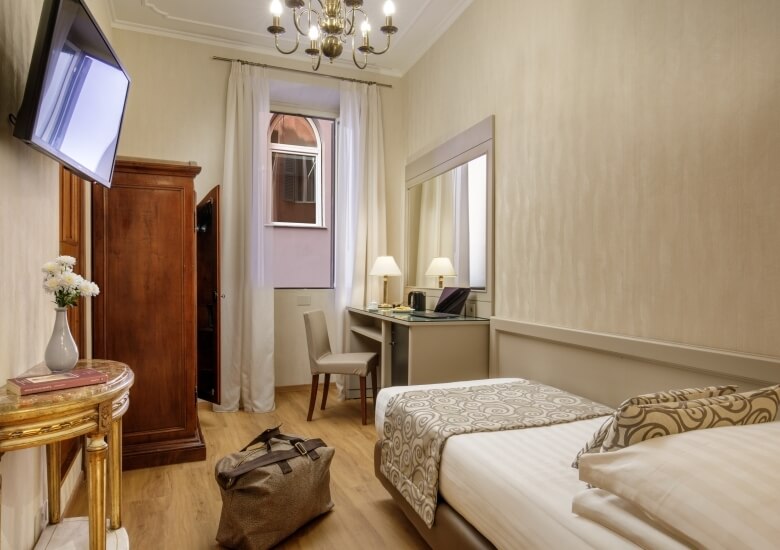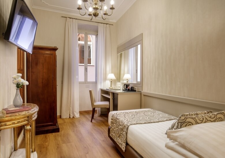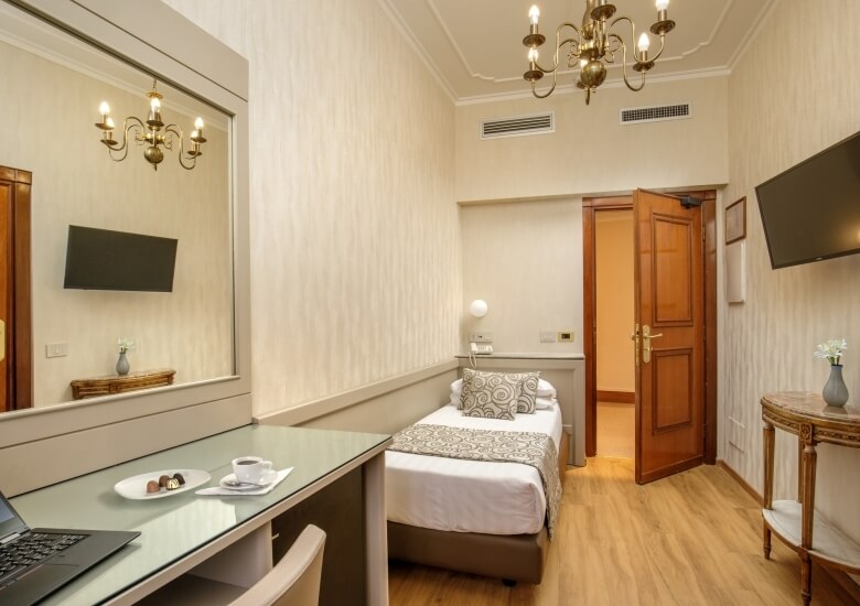 Our pretty 13  single room offers a classic décor with parquet floor. It is equipped with air conditioning, a flat-screen LCD TV, high-speed Wi-Fi, a safe, a minibar and a comfortable work desk. The private bathroom features a bathtub/shower, hairdryer dispensers (shower/shampoo and hand soap).