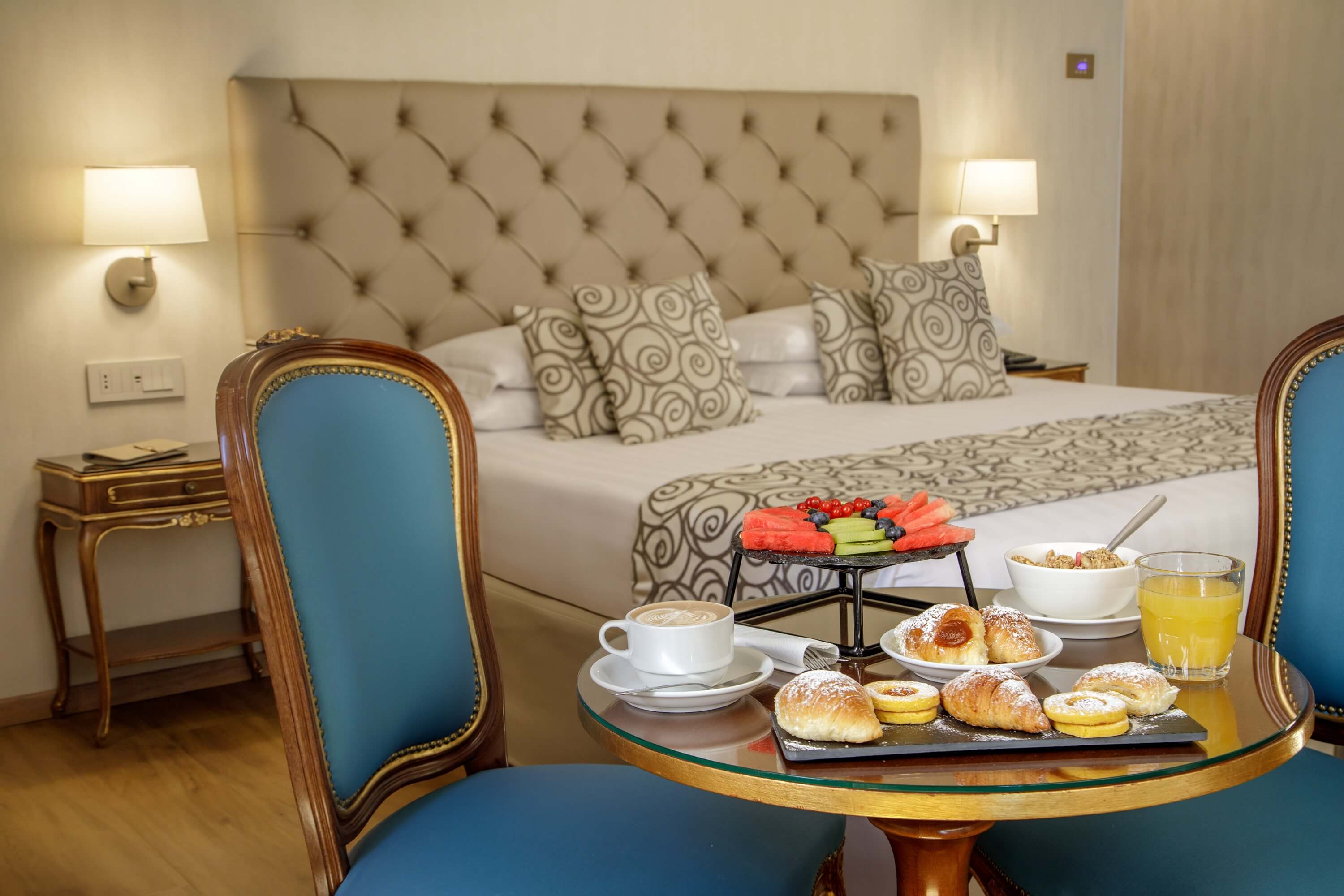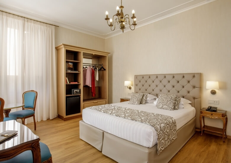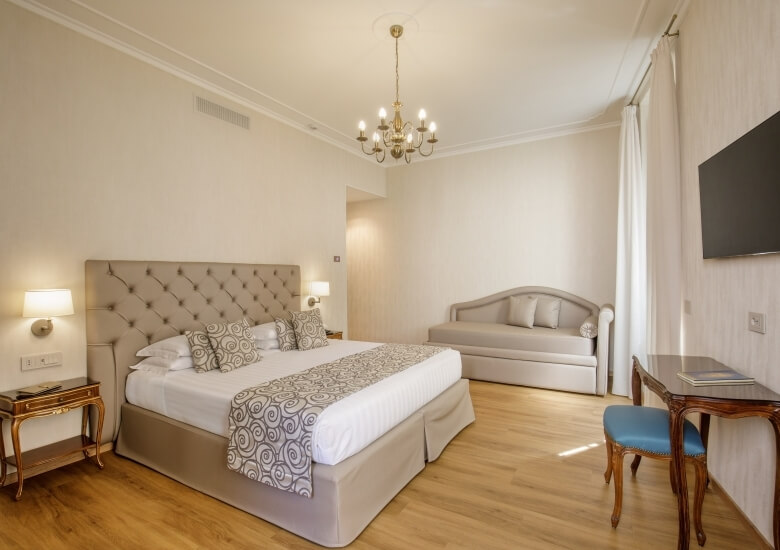 Our 23  triple room offers a classic décor with parquet floor. It has air conditioning and a flat-screen LCD TV, soundproofing, high-speed Wi-Fi, a safe, a minibar and a comfortable desk. The private bathroom features a bathtub/shower, hairdryer and dispensers (shower/shampoo and hand soap).